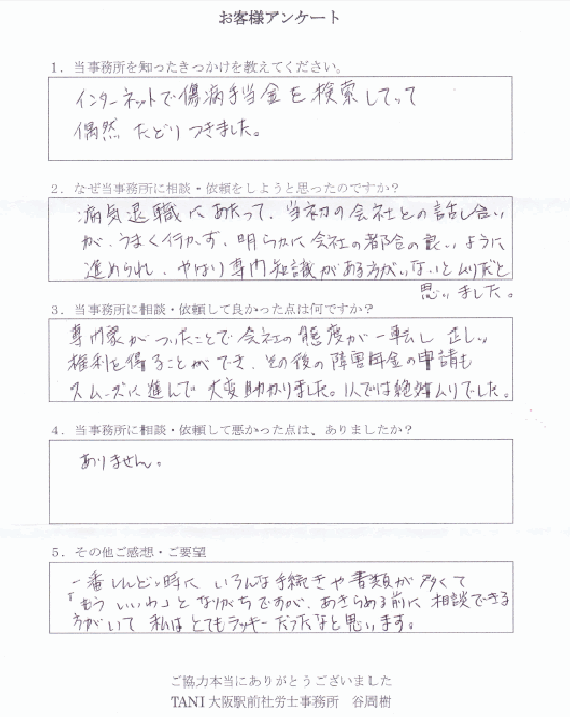 専門家がついたことで会社の態度が一転し正しい権利を得ることができ、その後の障害年金の申請もスムーズに進んで大変助かりました。1人では絶対ムリでした。