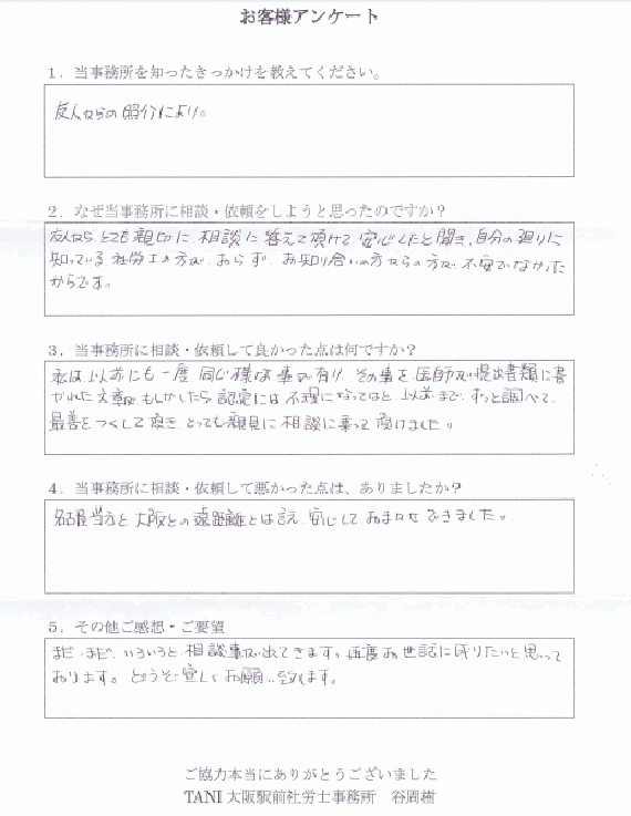 友人からとても親切に相談に答えて頂けて安心したと聞き、自分の廻りに知っている社労士の方がおらず、お知り合いの方からの方が不安でなかったからです。